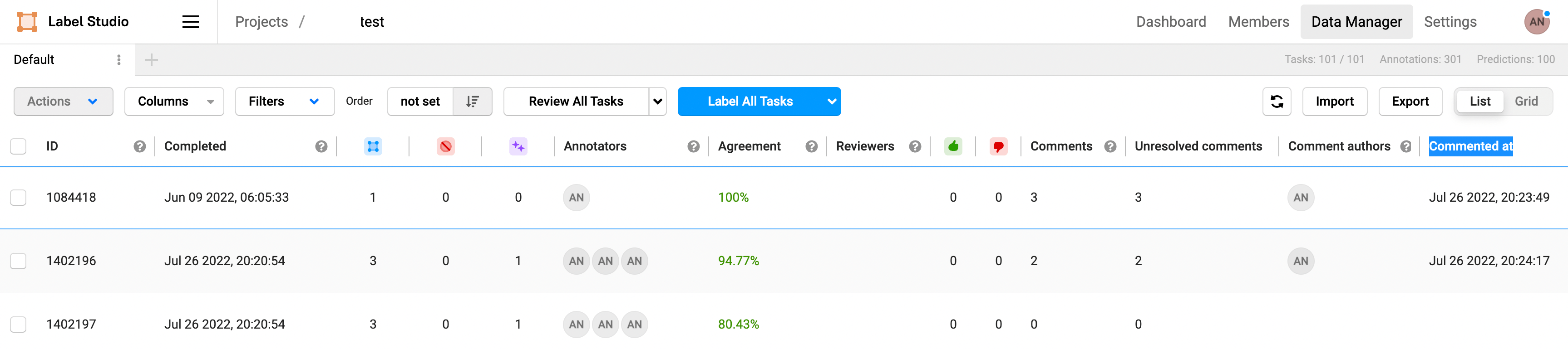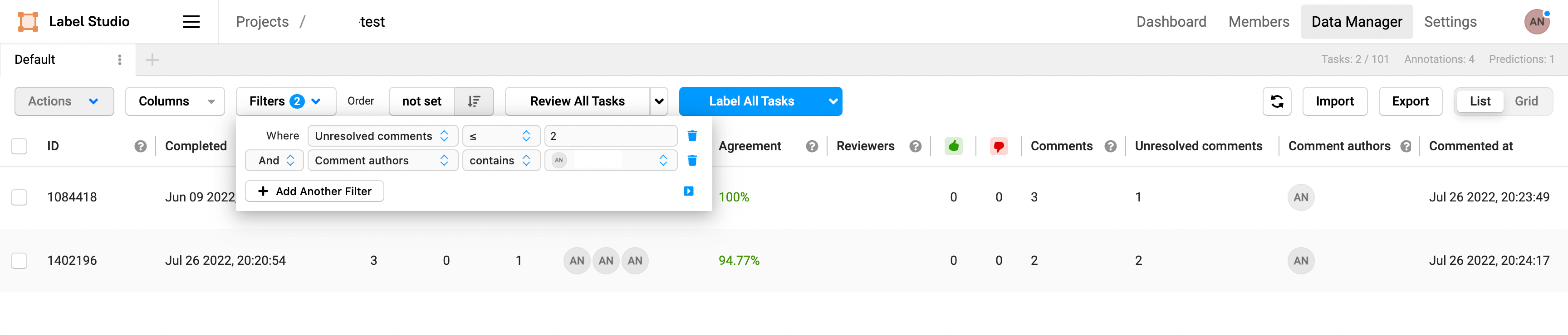 The Comments feature allows Annotators Reviewers and other higher roles to communicate and discuss queries on Label Studio Enterprise. Users will be notified of comments if they are associated with the task, and new comments will show up in the Notifications panel for a quick reference. Users can also filter and sort tasks by Comments status in the Data Manager view, such as finding tasks with unresolved comments from a particular user.