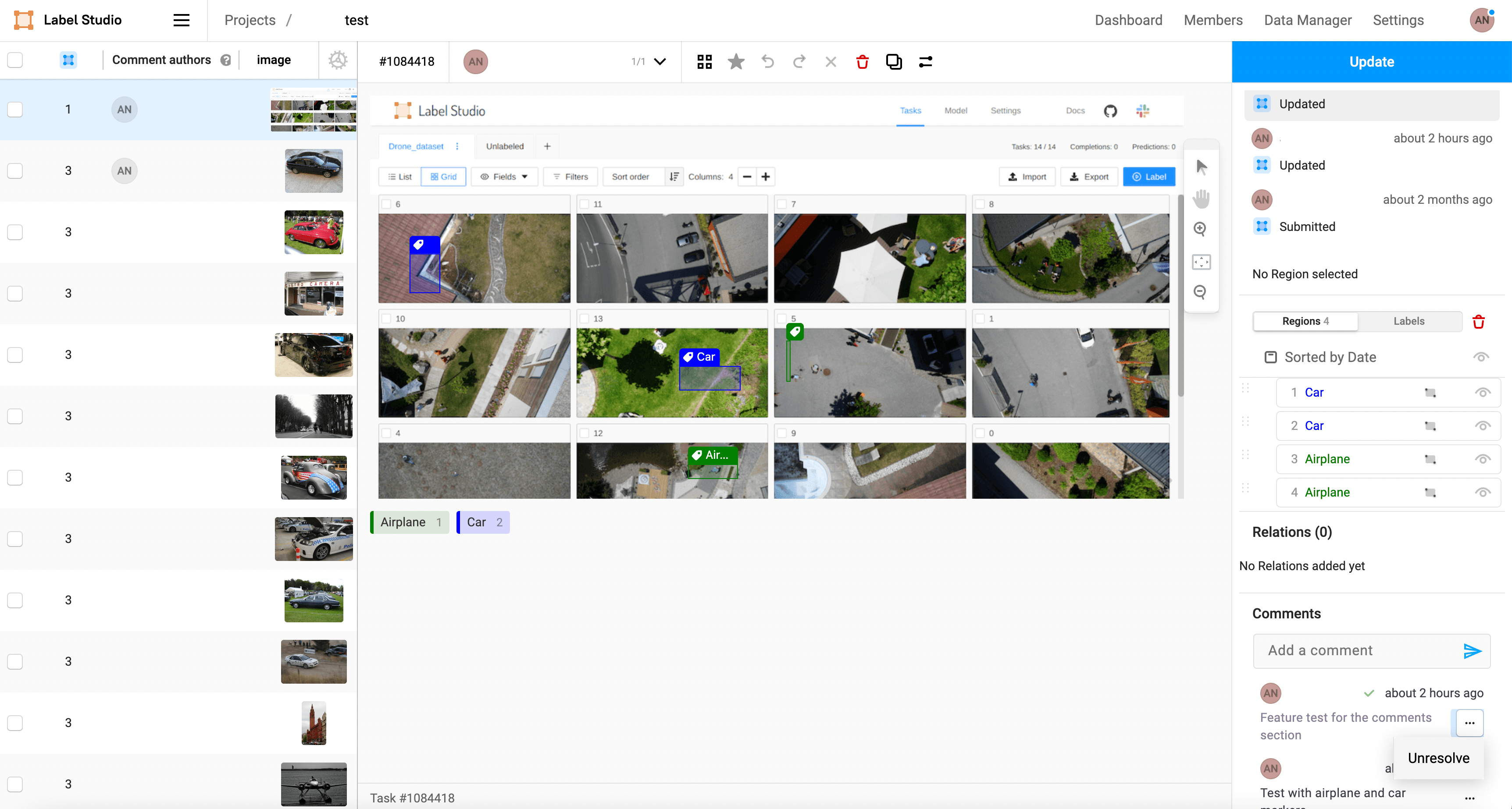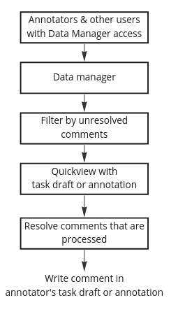 The following two workflows are flexible and can be combined. For example, in Figure 1A, Annotators don’t have access to the Data Manager and they would only use the Label Stream. They can write comments there, resolve them, and see notifications. Meanwhile, other roles like Managers or Administrators can filter tasks by “Unresolved comments” in the Data Manager and use the second workflow (see Figure 1B).