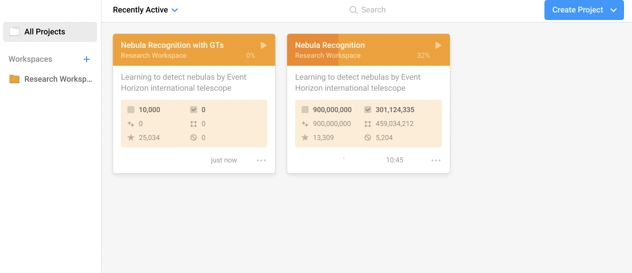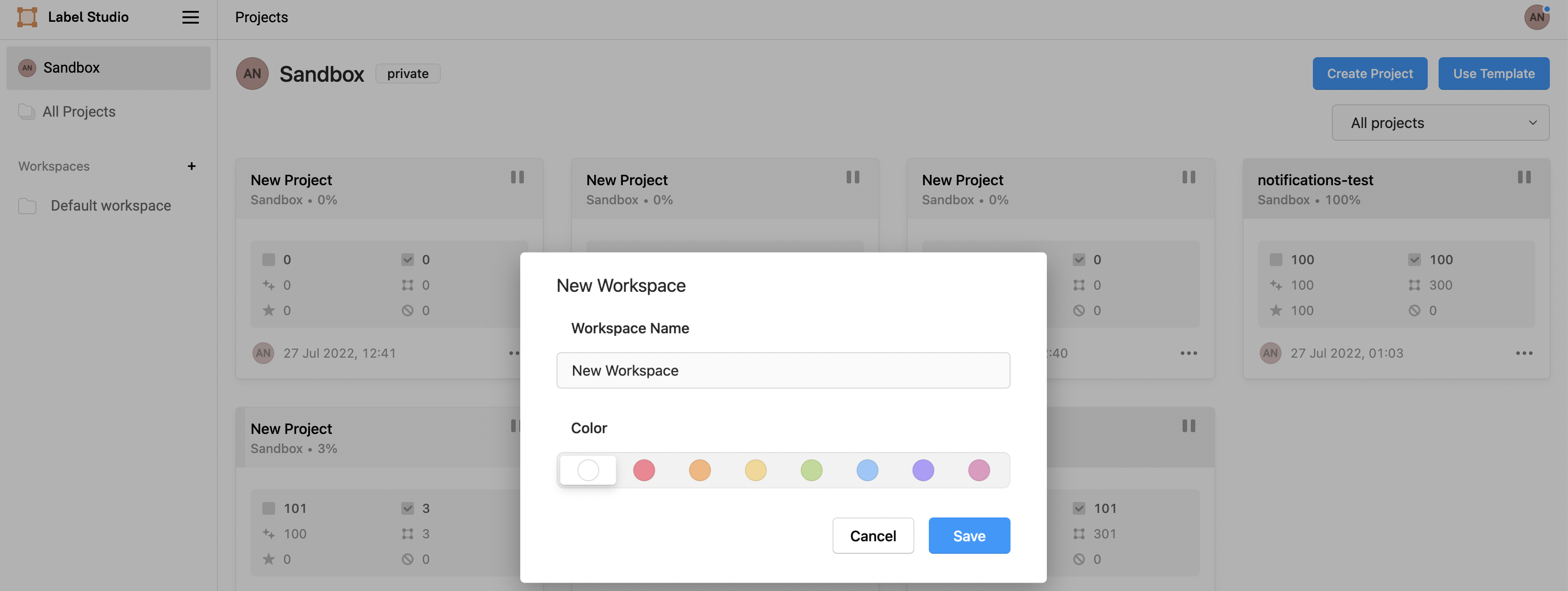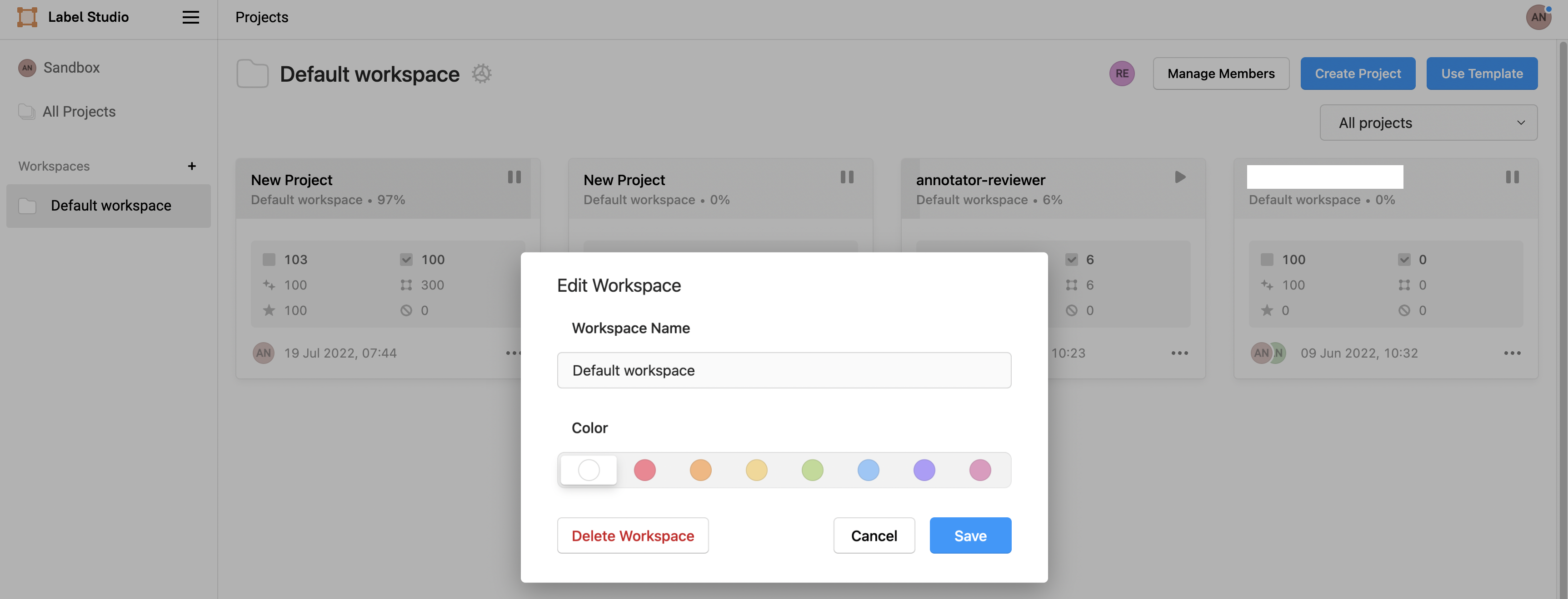 Organize projects into workspaces to make order in labeling data with Label Studio Enterprise.