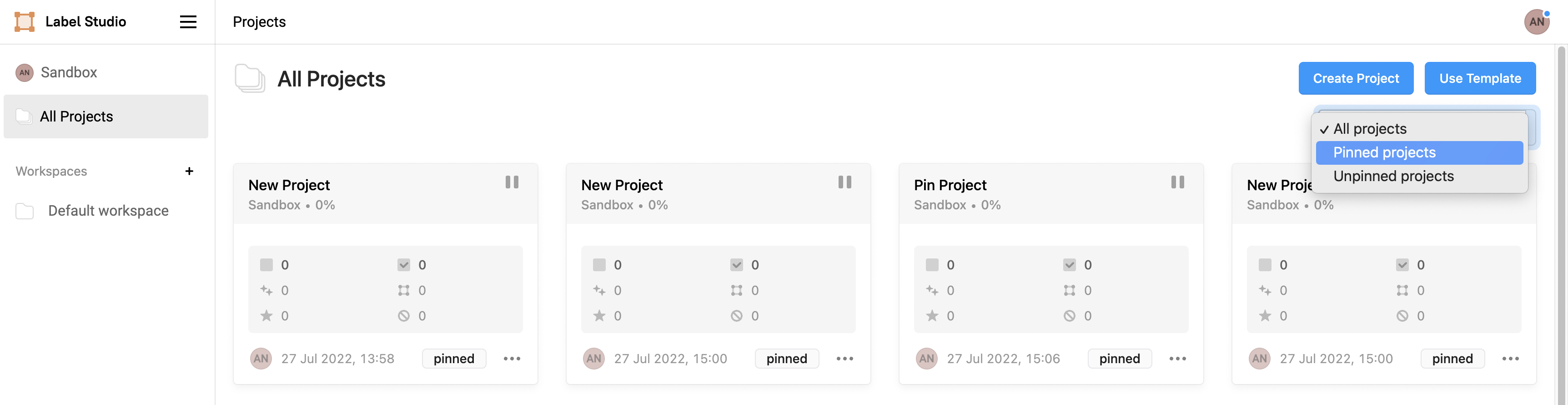 This section describes the user roles and capable actions on the Pin project and Unpin project feature by using the Label studio UI.