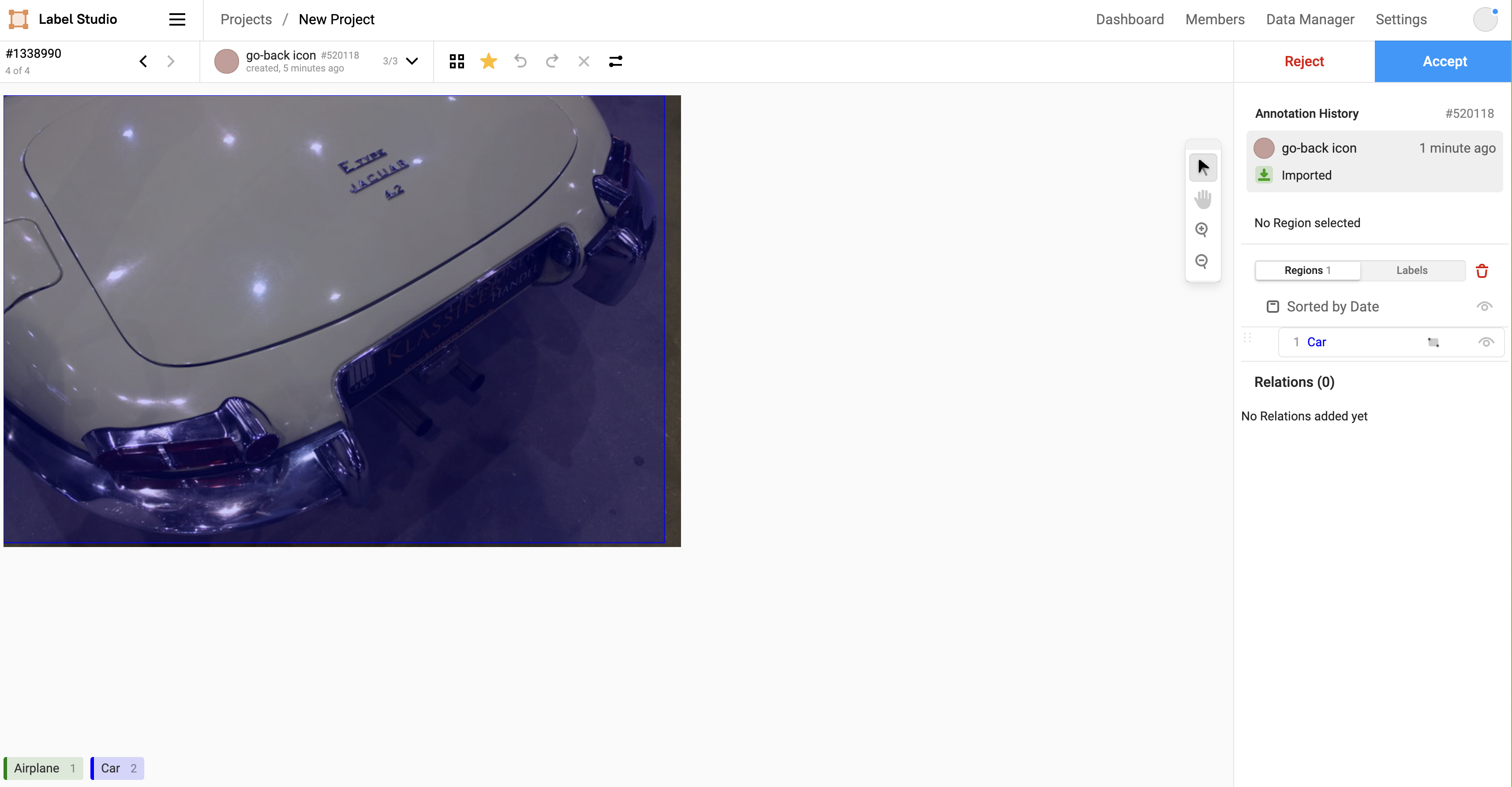 - If the annotation is completely incorrect, or you don’t want to attempt to correct it at all, click Reject to reject the annotation. To place a rejected task back in the Label Stream for annotation, you must delete the annotation. Rejecting an annotation does not return it to annotators to re-label.