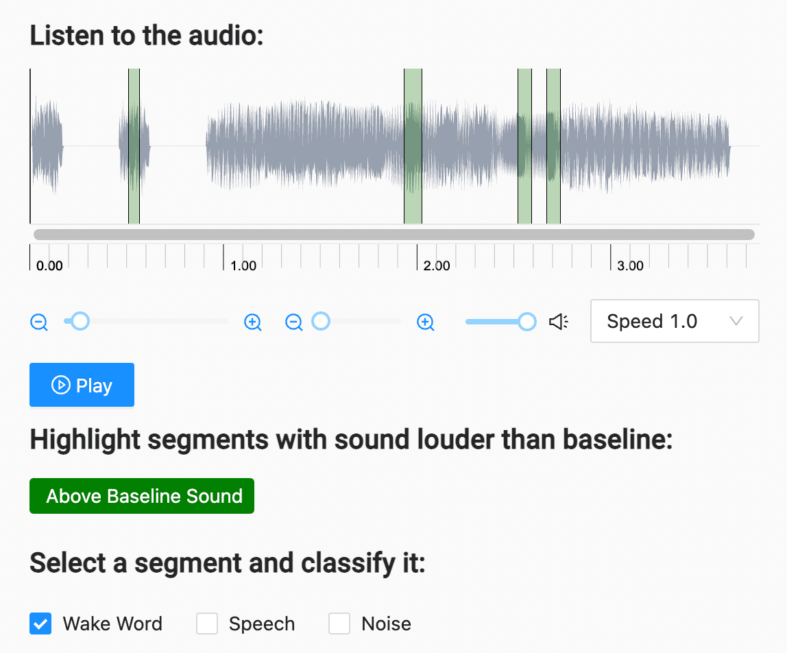 The choice="multiple" parameter allows annotators to select both “Speech” and “Wake Word” as options for a specific segment. The perRegion parameter means that each classification applies to a specific audio segment.