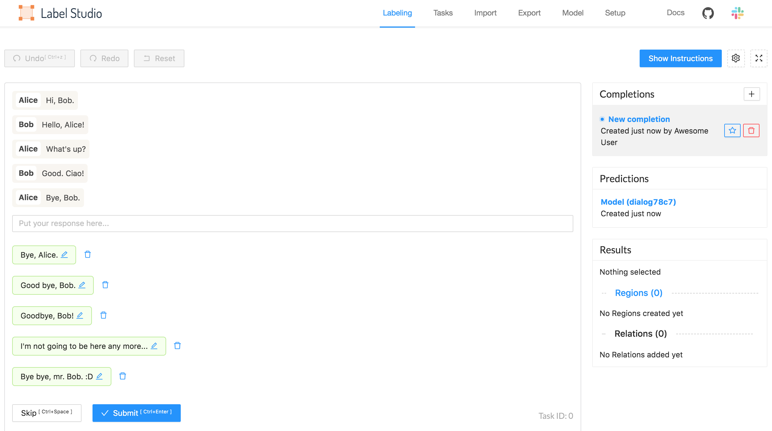 You can import your chat dialogs in the input format of <Paragraphs> object tag, or use a sample task import just to give it a try.